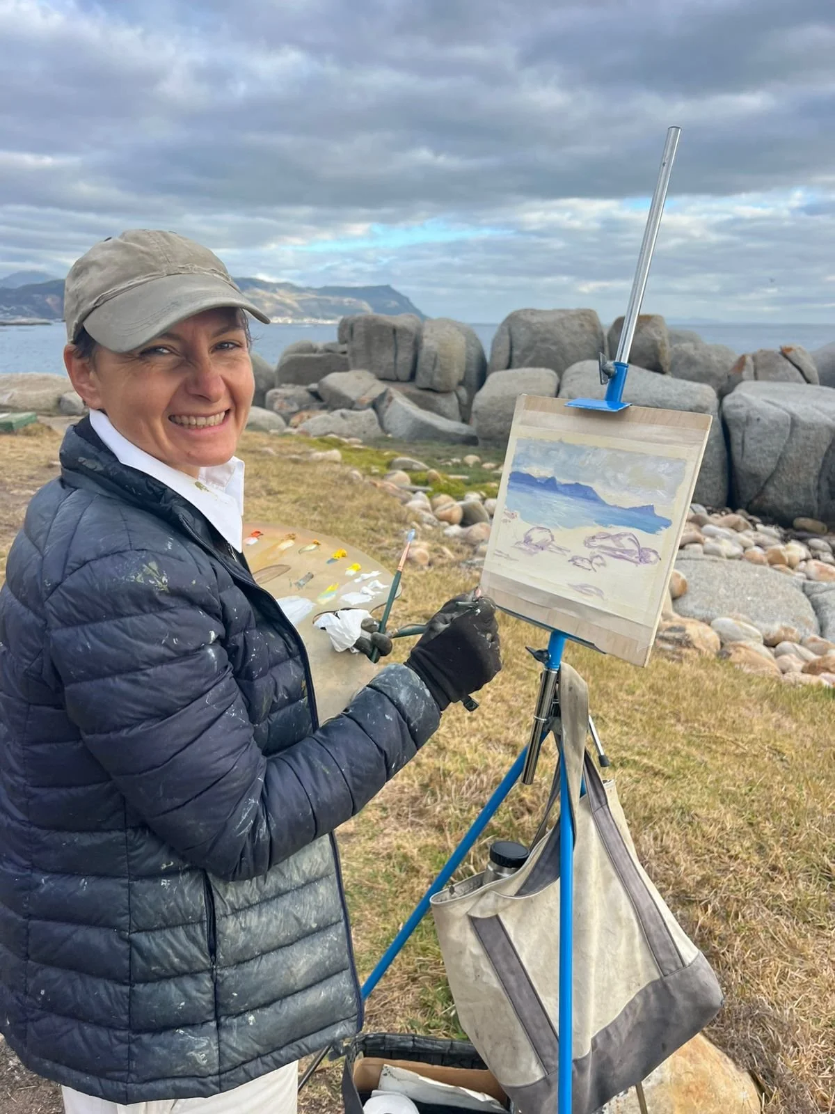 Joanna specialises in painting the ocean, beaches, mountains, natural Fynbos and the vineyards of the Cape, and also thrives when painting en plein air while traveling within South Africa and abroad.